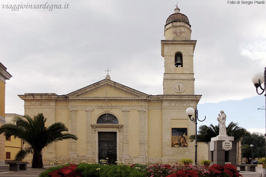 La chiesa parrocchiale di San Sebastiano Martire Percorso meno di un centinaio di metri lungo la via Sulcitana, alla destra della strada si vede la piazza della chiesa, sulla quale si affaccia la Chiesa di San Sebastiano Martire che è la chiesa parrocchiale del paese, la cui sede è, però, al civico numero 9 di via dell’Arma Azzurra, che è la strada che si trova una ventina di metri più avanti sulla destra. La chiesa, realizzata nel sedicesimo secolo, durante il periodo della dominazione spagnola, inizialmente ospitava solo due cappelle di stile gotico, è stata poi ingrandita verso il 1880 con l’aggiunta dell’abside, di quattro altre cappelle, ed all’esterno del campanile che si innalza alla destra dell’edificio. La chiesa di recente ha subito l’ennesima ristrutturazione, ed oggi appare situata in un complesso di circa quaranta per ottanta metri, con una struttura a due corti, come la tipica casa campidanese. Il muro di cinta, che non lascia intravedere ciò che sta all’interno del complesso, conserva, come un Museo, alcune colonne di ville romane, che sono state incassate dagli antichi costruttori in alcuni punti significativi come, ad esempio, gli spigoli dei muri. L’ampia facciata è, oggi, caratterizzata da un terminale piano sui lati e timpanato al centro, con una cornice che corre lungo la parte superiore del prospetto, dividendolo orizzontalmente in due ordini. L’artistico portale in bronzo del 1968, sormontato da una lunetta ed inquadrato da due coppie di semipilastri, contiene scene tratte dall’Apocalisse di San Giovanni, opera di don Antonio Desogus, sacerdote ed artista di grande valore, nato a Villasor nel 1932. L’interno è caratterizzato da un’aula unica con volta a botte, e lateralmente si trovano le cappelle intercomunicanti, alcune delle quali, conservano l’originaria copertura a crociera. All’interno, la chiesa ospita altre sculture dello stesso don Antonio Desogus, ed un moderno crocifisso opera di Franco d’Aspro, lo scultore piemontese destinato a farsi sardo d’elezione.