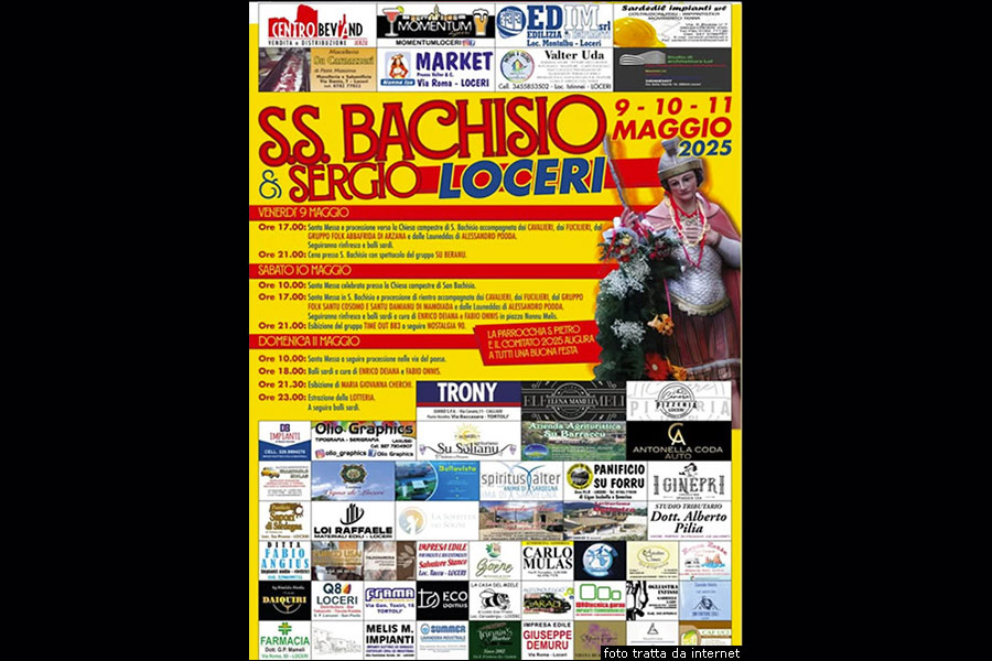 In contrasto con la data della morte il 6 ottobre, a Loceri i principali festeggiamenti in onore di San Bachisio e San Sergio si svolgono dal venerdì alla seconda domenica di maggio nella festa di Santu Bachis de Maju, ed iniziano portando Is Santusu dalla Chiesa parrocchiale alla sua Chiesa campestre, in una processione con cavalieri, fucilieri e launeddas. Si vuole ricordare il camino che i Santi hanno iniziato insieme, dato che San Bachisio viene ucciso davanti a San Sergio, nel tentativo di far rinnegare loro la fede. La sagra prosegue fino alla domenica e culmina con una processione per le vie del paese, con Su Cantu de Is Cocciusu, e con la benedizione conclusiva. San Bachisio viene considerato il protettore della pioggia, e la Sagra è nata, infatti, per combattere la siccità. Anticamente, per chiedere la grazia, i fedeli attraversavano il fiume adiacente in ginocchio, indossando una veste, trasportando il simulacro del Santo, e ne immergevano i piedi nell’acqua per poi compiere un percorso rituale all’interno della chiesetta campestre. Per l’occasione, un tempo si snodava una processione in cui i fedeli attraversavano il vicino fiume.