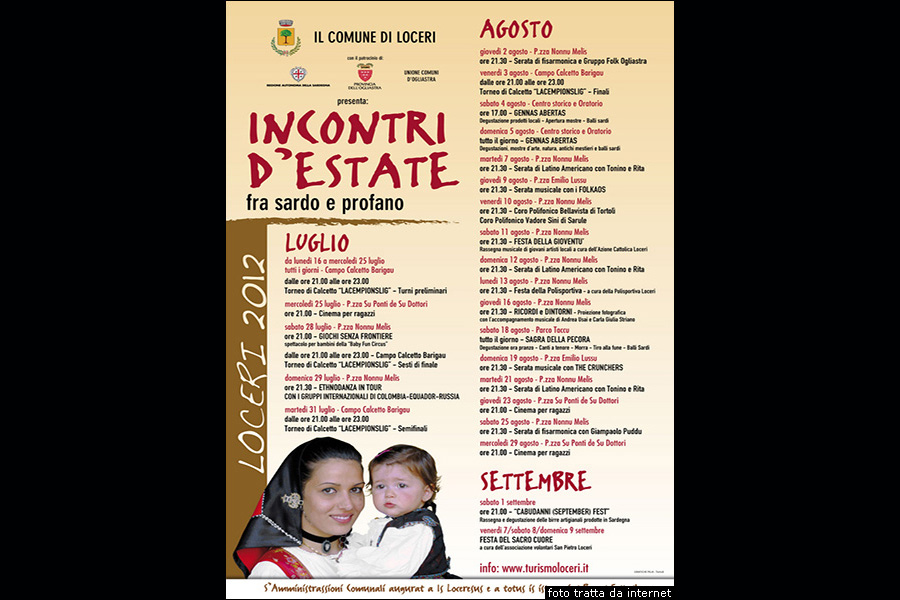 Il 29 giugno la Festa di San Pietro Apostolo, che è la Festa patronale del paese e prevede una distribuzione di pane nelle case degli ammalati; da luglio ad agosto, si svolgono le diverse manifestazioni di Incontri d’estate tra sacro e profano, che comprendono ad agosto la manifestazione Gennas Abertas, che presenta la tradizionale apertura dei cortili nel centro storico per degustare prodotti tipici locali, accompagnata da musica itinerante e balli sardi, ed a metà di agosto, la Sagra della pecora, presso il parco Taccu, celebrando i sapori della cucina ogliastrina; all’inizio di settembre, la Festa del Sacro Cuore di Gesù, che si articola in tre giornate, l’ultima delle quali termina con la prima domenica di settembre e si celebra tra Loceri e Taccu, località a pochi chilometri dal paese dove sorge la piccola chiesetta campestre vicino al parco da cui prende il nome; ad ottobre, la celebrazione liturgica di Santu Bachis e Sèrgiu de Atòngiu, ossia di San Bachisio e San Sergio di ottobre.