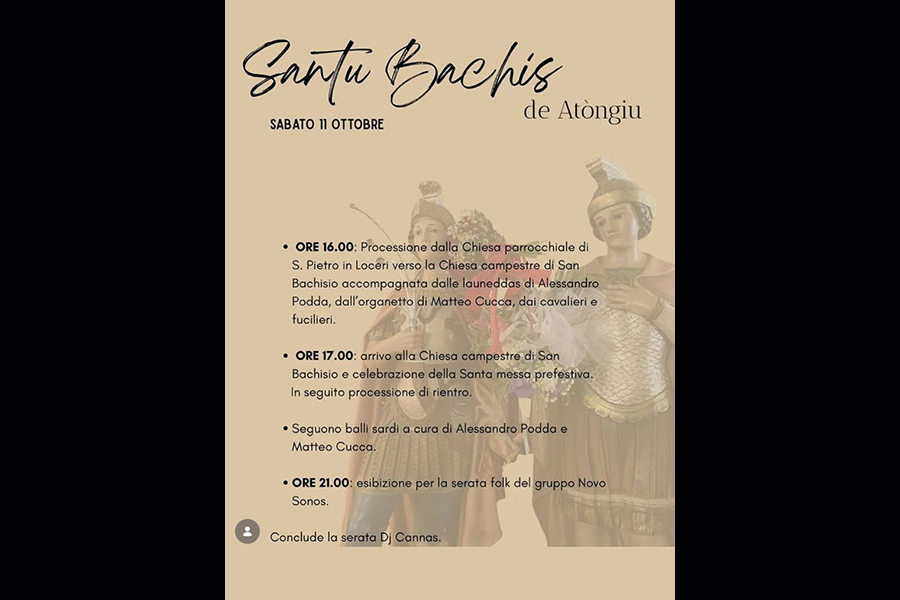 Chi è stato San Bachisio? Bachisio o Bacchisio è un nome presente solo in Sardegna, in particolare nel Nuorese e nel Sassarese, il cui culto riporta all’epoca bizantina da quando un’antichissima leggenda è stata tramandata oralmente da padre a figlio. Bachisio viene venerato nella Chiesa Orientale, in particolar modo negli ambienti militari, assieme al commilitone Sergio. San Bachisio è il patrono di Loceri che lo onora dal sedicesimo secolo, di Bolotana ed è festeggiato anche ad Onanì. Secondo la tradizione nasce in Siria verso il 265 ed è un ufficiale dell’esercito romano molto apprezzato da Valerio Massimiliano Augusto, con il quale Diocleziano ha condiviso il potere. Durante una spedizione militare, Bachisio ha a Milano una visione mistica, si fa quindi battezzare da Biagio, vescovo di Sebaste in Cappadocia. Recatosi in Siria, rifiuta di adeguarsi alla richiesta di Antioco, prefetto della Siria, di rinnegare il Dio cristiano. I Santi Bachisio e Sergio hanno vissuto insieme la vicenda del martirio. San Bachisio viene arrestato patendo orribili tormenti e martirizzato a Barbalisso, città siriana sulle sponde di Eufrate, il 6 ottobre del 295 sotto gli occhi di San Sergio, affinché almeno lui abiurasse la fede cristiana, ma dopo alcuni giorni anche Sergio viene decapitato