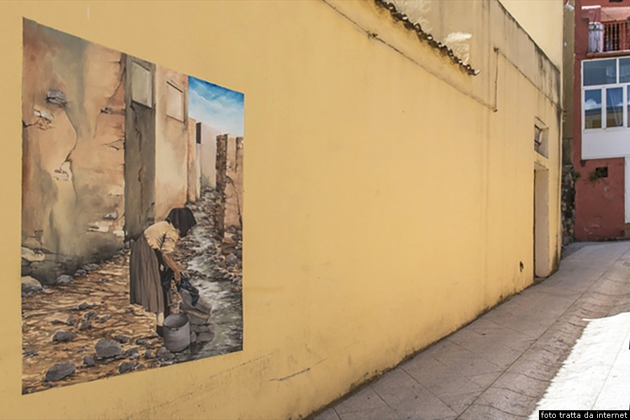 Lungo la via Roma verso il Museo Vecchi Frantoi Percorsa una sessantina di metri dallo slargo arredato con le panchine per la sosta dei passanti, alla destra della via Roma parte come deviazione il vico III Roma che porterà al Museo Vecchi Frantoi. Sulla facciata destra dell’edificio che si trova al civico numero 57 della via Roma, affacciato appunto sul vico III Roma, si trova il murale che rappresenta una figura femminile che lava i panni, realizzato nel 2015 dall’artista Angela Deiana, nata nel 1976 ad Arzana. L’opera rappresenta una donna di profilo china su un ruscello che attraversa una via di paese mentre lava dei panni, e si è classificata al terzo posto nella prima edizione del concorso Murales Art Festival Scorci di memoria, organizzato dal Comitato Loceri Eventi e patrocinato dall’amministrazione comunale.