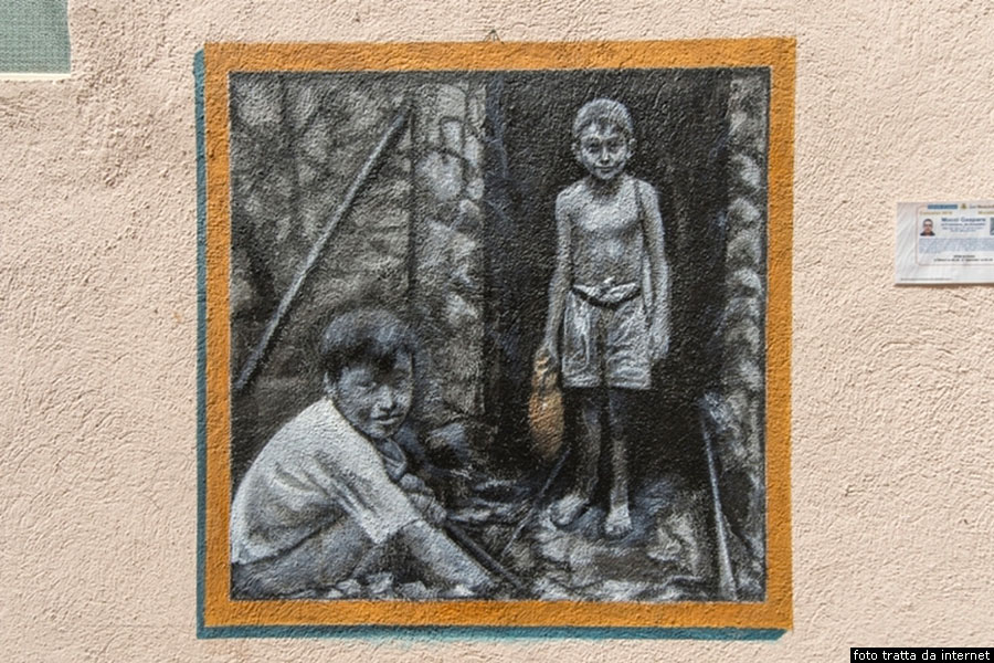 Dalla via Roma prendiamo la deviazione a destra nella via Dante Alighieri, la seguiamo per una quarantina di metri e vediamo, alla destra della strada, sul prospetto laterale sinistro dell’edificio al civico numero 1 della via Regina Elena che di affaccia appunto sulla via Dante Alighieri, il murale che rappresenta bambini che giocano, realizzato nel 2016 dall’artista Gaspare Mocci, nato nel 1965 a Cagliari. Questa opera consiste nella trasposizione pittorica di una fotografia d’epoca raffigurante due bambini davanti ad un uscio, posta entro una cornice appesa alla parete. L’opera è stata realizzata nell’ambito della seconda edizione del premio nazionale Murales Art Festival Scorci di memoria, organizzato dal comitato Loceri Eventi e patrocinato dall’amministrazione comunale, non è stato tuttavia possibile reperire bibliografia specifica riguardante l’autore.