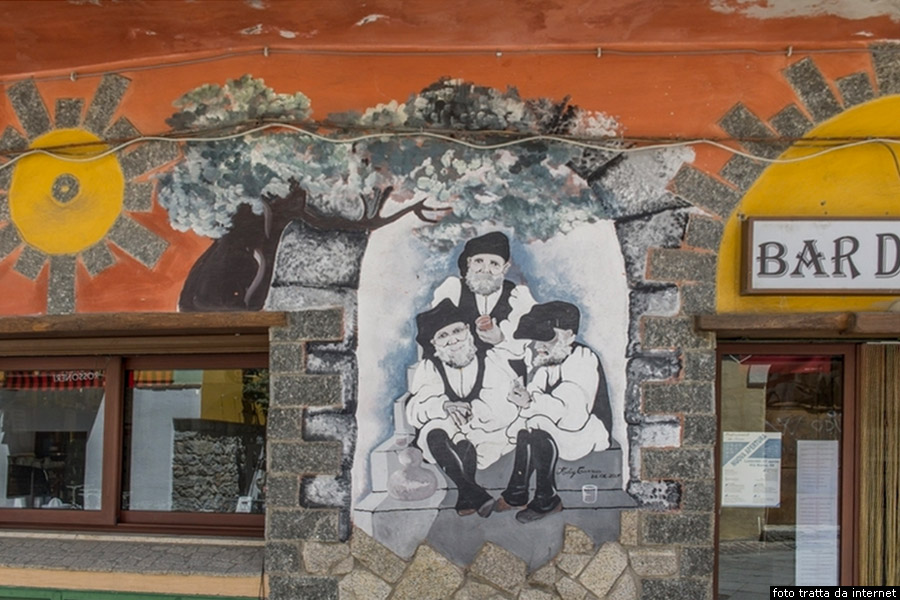 Di fronte al vico III Roma, alla sinistra della via Roma sulla facciata dell’edificio che ospita il Bar del Museo, al civico numero 42 della via Roma, si trova il murale che rappresenta figure maschili in costume tradizionale, realizzato nel 2000 da Kety Carrus, un’artista nota per la realizzazione di murales e opere di riqualificazione artistica, con un intervento documentato nel catalogo dei beni culturali della Sardegna. Questa opera rappresenta tre uomini anziani dalla folta barba che giocano a carte e bevono del vino seduti su dei gradini, sotto l’ombra di un albero frondoso. Il tema è espresso con una figurazione naturalistica, e rappresenta una scena di vita quotidiana del mondo agro pastorale, con gli antichi mestieri e con i momenti collettivi della comunità. Non è stato possibile reperire bibliografia scientifica riguardante l’autore.