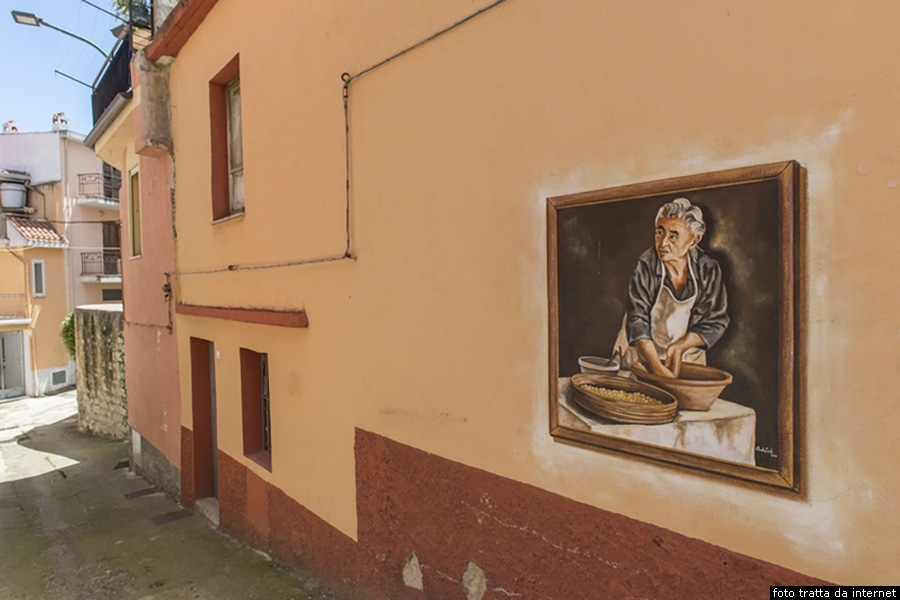 I murali lungo la via Roma Sulla facciata sinistra dell’edificio che si trova al civico numero 57 della via Roma, affacciata sulla successiva deviazione a destra della via Roma, che è la via Dante Alighieri, si trova il murale che rappresenta una figura femminile che fila la lana, realizzato nel 2015 dall’artista Mario Ramazzotti, nato in Sardegna, ma trasferitosi a Firenze appena bambino. L’opera rappresenta mediante un trompe l’oeil una donna in piedi sotto un arco a sesto ribassato intenta a filare la lana, che si è classificata al primo posto nella prima edizione del concorso Murales Art Festival Scorci di memoria, organizzato dal Comitato Loceri Eventi e patrocinato dall’amministrazione comunale. Mario Ramazzotti, al quale è stata affidata la direzione artistica della seconda edizione della rassegna, si è ispirato ad una fotografia degli anni Sessanta raffigurante un’anziana donna di Santa Maria Navarrese. Le notizie riguardanti l’opera sono state fornite oralmente dall’autore.
