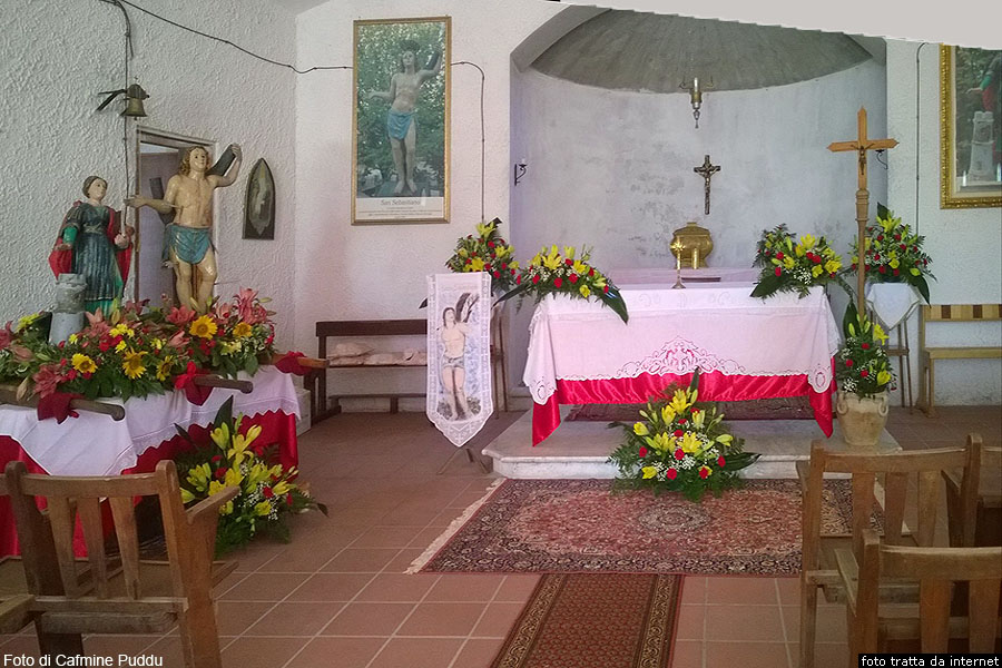 I ruderi della vecchia Chiesa di San Sebastiano Lungo la Strada Comunale San Sebastiano, seguita per un paio di chilometri si arriva al bivio, dove ora prendiamo a sinistra, e, dopo una cinquantina di metri, vediamo, alla sinistra della strada, i ruderi della vecchia Chiesa campestre di San Sebastiano. In origine la chiesa di San Sebastiano era stata eretta dai Seuesi a poca distanza dal paese, tra il 1652 e il 1655, come ex voto fatto al Santo affinch liberasse la popolazione dalla peste. Questa Chiesa campestre si trovava a poca distanza dalla miniera di carbone di Fundu ’e Corongiu, lungo la strada tra la miniera e la sua laveria, ed era stata realizzata per servire gli operai che lavorava in questa miniera. Dato che la prima Chiesa dedicata a San Sebastiano si trovava in pessime condizioni, alla fine degli anni ottanta del Novecento è stata demolta e ne è stata costruita un’altra nuova, molto vicina, proprio sulla collinetta tra le due strade del bivio che abbiamo appena incontrato.
