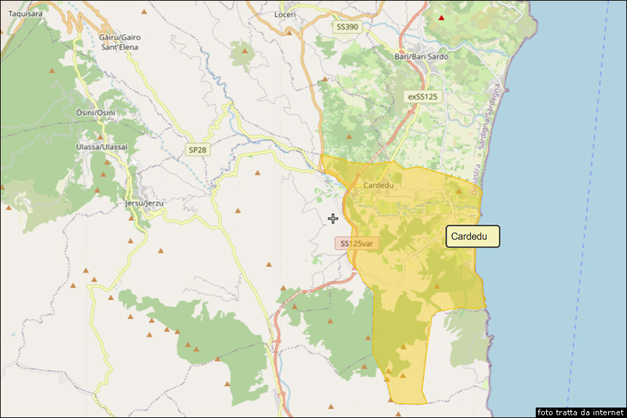 In viaggio verso CardeduDal Municipio di Gairo prendiamo verso sud la SP28, usciamo dall’abitato e, a quattordici chilometri da Gairo, la strada provinciale va ad immettersi sulla SS125 Orientale Sarda e, dopo altri due chilometri e mezzo, arriva nell’abitato di Cardedu, che era un tempo la frazione Gairo Cardedu del comune di Gairo e che, dal 1984, è diventato un comune autonomo. Dal Municipio di Gairo a quello di Cardedu, lungo questa strada si percorrono 17.2 chilometri. Possiamo non seguire questa strada, ma proseguire da Tertenia con la SS125 Orientale Sarda per salire in direzione nord. In pratica, evitando la deviazione all’interno verso Usini e Gairo, sulla SS125 Orientale Sarda, a 10 chilometri da Tertenia, al valico di Genna ’e Cresia incontriamo la deviazione a sinistra sulla SP11, che ci porterebbe a Jerzu, la Città del Vino, che abbiamo già visitato in una precedente tappa. Superata la deviazione per Jerzu, la strada scende verso il mare e ci fa arrivare, dopo 11 chilometri, al paese chiamata Cardedu. Dal Municipio di Tertenia a quelllo di Cardedu, lungo questa strada si percorrono 21.3 chilometri. Il comune chiamato Cardedu Il comune chiamato Cardedu (altezza metri 40 sul livello del mare, abitanti 1.923 al 31 dicembre 2021) nasce come frazione del paese Gairo dopo le alluvioni del 1951 e 1953 che hanno portato gran parte della popolazione a trasferirsi sulla costa, e che verrà separato dal comune di Gairo diventando comune autonomo nel 1984. Situato nella parte sud orientale della provincia di Nuoro, nella piana del torrente Pelau, nell’Ogliastra, è attraversato dalla SS125 Orientale Sarda. Il territorio Comunale, classificato di collina, ricco di vegetazione mediterranea e di boschi secolari, ha un profilo geometrico ondulato, con variazioni altimetriche molto lievi, che arrivano solo a un massimo di 40 metri sul livello del mare. Territorio che si estende su quasi duemila ettari, ricchi di vegetazione mediterranea e di boschi secolari, con fauna e flora unici che formano un complesso naturalistico eccezionale ruotante intorno al Monte Ferru, di circa 875 metri di altezza. Il mare, con fondo sabbioso, e un litorale che alterna piccole insenature a distese di sabbia, scogli, sassi, e porfidi rossi a calette incantevoli, crea un paesaggio vario che sopravvive incontaminato e selvaggio.