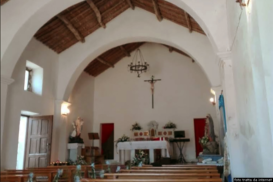L’interno presenta un’unica navata a pianta rettangolare con il tetto a capanna, caratteristico delle piccole Chiese campestri, con copertura in canne, tegole sarde e travi in legno, La chiesa, che si trova in territorio di Cardedu, appartiene però alla comunità di Gairo, ed è stata un tempo punto di riferimento per i suoi abitanti, che vi trovavano riparo e protezione.
