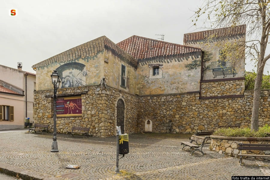 L’antico Oratorio citato dalle fonti parrocchiali gi dalla fine del Cinquecento come sede dell’antica Confraternita della Santa Croce, oggi non più operante, che curava le toccanti rappresentazioni della Settimana Santa. Il riconoscimento formale della Confraternita è avvenuto nel 1646, come risulta dalla Bolla firmata dal cardinale Francesco Barberini, e conservata presso l’archivio storico della parrocchia. La Confraternita, che ha operato fino alla metà del ventesimo secolo, era composta da un gruppo maschile e da uno femminile, e si occupava della gestione dell’Oratorio e del suo patrimonio. I murales di Vincenzo Ganadu e Antonello Nuvoli nella piazzetta di fronte all’Oratorio di Santa CroceAll’altro lato della strada, ossia alla destra della via Brigata Sassari, troviamo una piazzetta recentemente realizzata nell’ambito del progetto di riqualificazione del centro storico, con al centro un albero, sotto la cui ombra trovano spesso refrigerio gli anziani del paese seduti sulle panchine in legno, e dalla quale parte sulla destra la via Trieste. Sui muri dell’edificio affacciato su questa piazzatta è stato realizzato un bel murale che rappresenta Architetture con attrezzi agricoli e figure femminili, realizzato da Vincenzo Ganadu e Antonello Nuvoli.