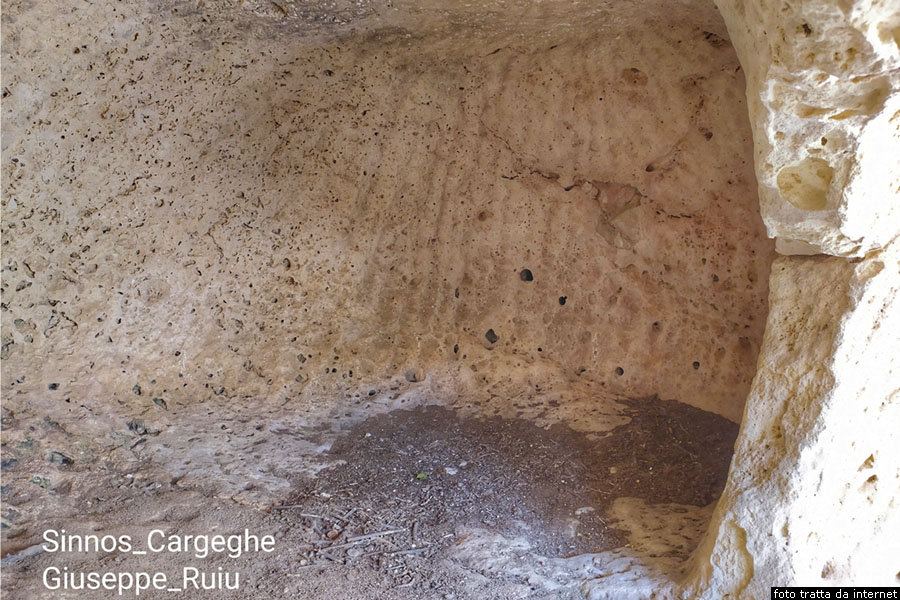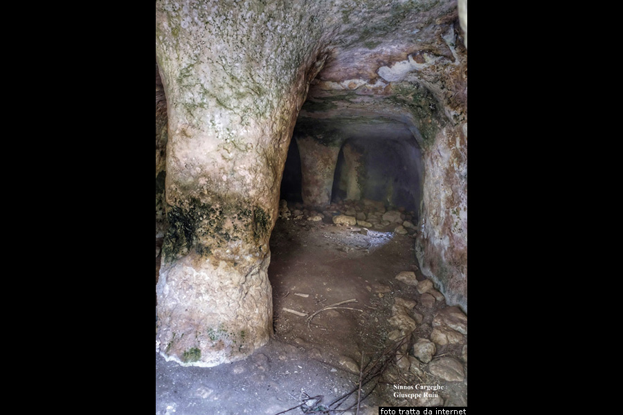 I resti della necropoli di Pedras SerradasLungo l’altura che porta alla cima rocciosa di Pedras Serradas, a sud dei resti del nuraghe si aprono a diversi livelli le tombe ipogeiche che costituiscono la Necropoli di Pedras Serradas. La necropoli è costituita da cinque tombe scavate nella roccia calcarea, che presentano uno sviluppo planimetrico abbastanza semplice, costituito da un’anticella e dal retrostante ambiente principale sul quale, in alcuni casi, si apre un vano laterale realizzato in tempi successivi. Alcuni vani sono caratterizzati dalla presenza, sulle pareti, di partiture architettoniche in rilievo, ossia da lesene, zoccoli e fregi. Due domus de janas, la III e la IV, si presentano ancora notevolmente interrate. Passato il nuraghe, lungo il sentiero per l’area archeologica di Pedras Serradas che si dirige verso sud, si raggiunge in una cinquantina di metri la tomba I, una tomba ipogeica composta da tre ambienti, l’anticella e una camera principale sulla quale si apre una celletta secondaria. Introduceva nell’anticella un portello con rincasso a cornice aperto sulla parete di fondo di un piccolo padiglione quadrangolare. Un foro semicircolare, prodotto dell’ampliamento dell’originario portello, introduce nell’ambiente principale quadrato che conserva, in corrispondenza dell’angolo nord, un bancone risparmiato nella roccia. Il vano, quadrato, è caratterizzato dalla presenza, sulle pareti, di partiture architettoniche in rilievo, ossia lesene, zoccoli e fregi. Presso l’angolo est della cella è scavato l’ingresso del vano laterale, un ambiente di pianta semiellittica che presenta, al centro del pavimento, una fossetta. In prossimità dell’ingresso alla tomba si trova adagiato sul terreno il frammento della lunetta superiore di una stele centinata che forse, originariamente, era applicata sul prospetto di una delle sepolture, e che quindi potrebbe testimoniare un riutilizzo della sepoltura in età nuragica.