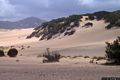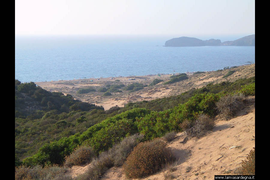 La spiaggia di Pistis e la spiaggia chiamata le Sabbie d’OroTornati indietro dalla deviazione verso le dune, riprendiamo la SP65. A quattro chilometri e mezzo da Sant’Antonio di Santadi svoltiamo a destra, seguendo le indicazioni per l’Hotel Sabbie d’Oro, e, dopo un chilometro, raggiungiamo una stupenda spiaggia chiamata le Sabbie d’Oro, che è la prosecuzione verso sud della spiaggia di Pistis. La spiaggia delle Sabbie d’Oro e caratterizzata da un arenile di grandi dimensioni, costituito da una grande distesa dorata, con sabbia chiarissima, non finissima, compatta e abbondante, affacciato su un mare trasparente, sempre in movimento, e quasi mai calmo dai bellissimi colori e dalle bellissime onde basse e lunghe. Il mare è caratterizzato da una colorazione tra l’azzurro cangiante e il verde, e da un fondale relativamente basso e sabbioso, con la presenza di qualche scoglio, soprattuttonei pressi della scogliera a sud, dove si trova un’alta scogliera di basalto. Il vento che soffia abbondante nella zona, attrae numerosi amanti del windsurf. La spiaggia è abbastanza frequentata in alta stagione, ma grazie alle sue dimensioni non risulta mai troppo affollata. Sono presenti vari punti ristoro, possibilità di affittare ombrelloni, lettini ed altre attrezzature da spiaggia.