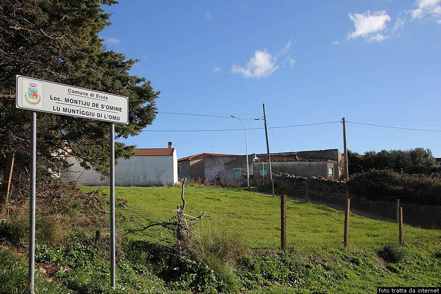 La frazione Montiju de s'OmineProseguendo sulla prosecuzione della via Walter Frau, dopo aver superato le fontana di Erula, percorsi appena quattrocento metri in direzione sud ovest, arriviamo a vedere alla sinistra della strada gli edifici della piccola frazione Montiju de s'Omine, chiamata anche Lu Montíggiu de l’Omu.