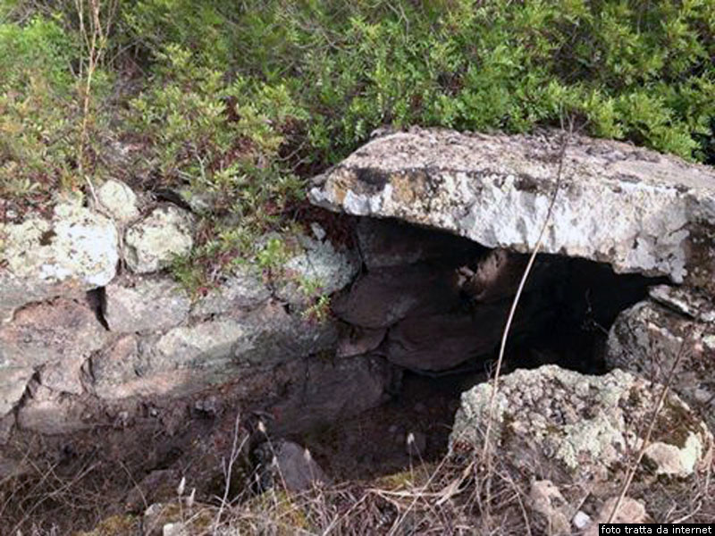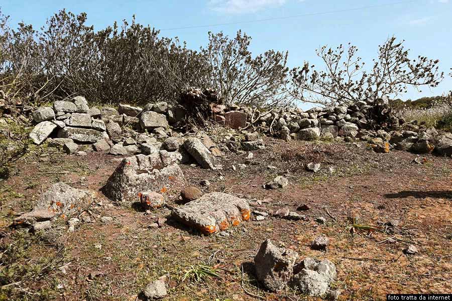 Poco più avanti troviamo la tomba di giganti di L’Ea CanaProseguiamo sempre in direzione nord ovest sulla vecchia strada di collegamento di Erula per Perfugas per quasi duecento metri e, un poco lontano, alla destra della strada, immersa nella vegetazione, di trova la bella tomba di giganti di L’Ea Cana, chiamata anche tomba di giganti di Putzu Canu dal nome della località nella quale si trova. Interrata, realizzata con filari di pietre subsquadrate, è molto grande e presenta l’esedra ancora in buono stato, ottenuta con grosse lastre di trachite bruna disposte a taglio.