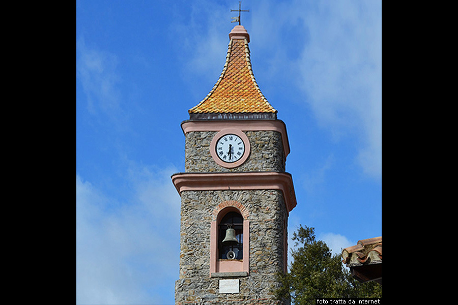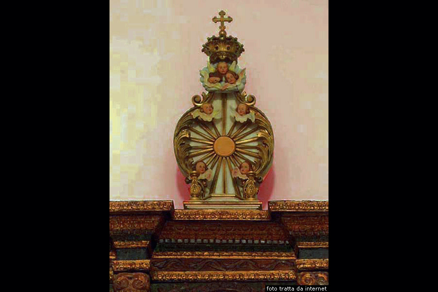 In alto, sulla sommità del polittico, è presente un tronetto per esposizione eucaristica, nel quale sono presenti due volute fitomorfe dorate che partono da due cherubini al naturale che racchiudono una raggiera al cui centro la rappresentazione del Santissimo Sacramento, alla sommit una nuvola con tre cherubini, con sul tutto una corona chiusa sormontata da una croce trilobata, mentre sulla base sono presenti due vasetti dorati intagliati a racemi e girali. Sul retro della chiesa si eleva l’imponente e massiccio campanile a canna quadrata, realizzato in pietra, alleggerito da quattro monofore semicircolari nelle quali sono poste le campane. La torre campanaria è conclusa da un’elegante cupoletta dorata con croce.