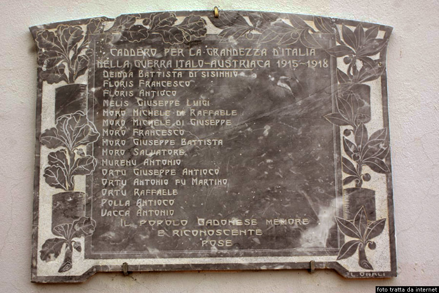 Alla destra, questa decorazione è corredata dai versi di un poeta locale, dato che l’opera racconta mediante un linguaggio corsivo e un deciso dinamismo, che segue l’andamento dello spazio architettonico, l’antico rito de Is Fraccheras, che consiste in una corsa per le vie del paese, la sera del 2 novembre, compiuta dai giovani di Gadoni con dei lunghi fasci di asfodelo incendiati, allo scopo di accompagnare le anime dei defunti nell’aldilà. Il Monumento ai Caduti sul LavoroDalla piazzatta del Minatore, percorso un altro centinaio di metri lungo il corso Umberto I, arriviamo al punto dove parte sulla destra la via Santa Maria. Qui, subito ad angolo con la via Santa Maria, si vede alla destra del corso il Monumento ai Caduti sul Lavoro di Gadoni.