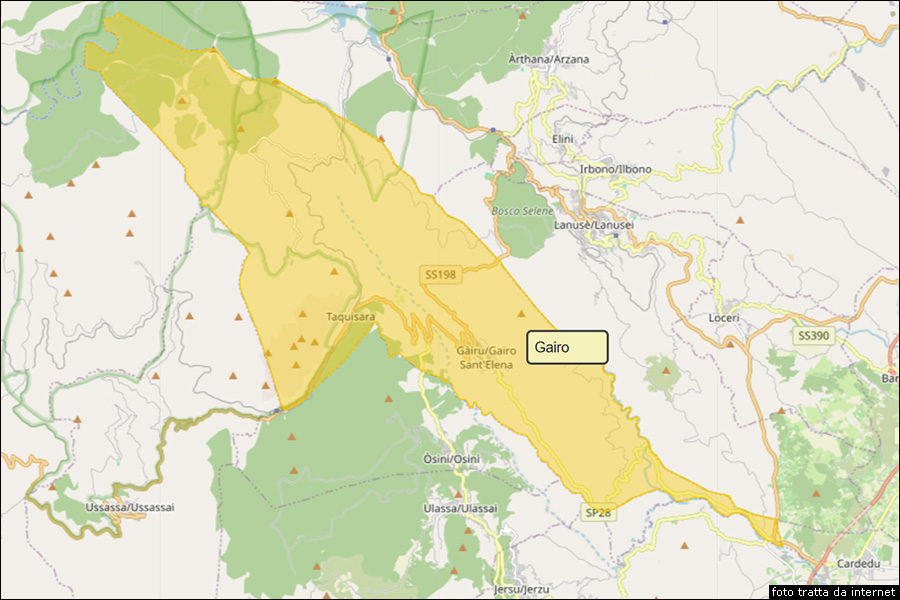 In viaggio verso GairoCirca quasi tre chilometri dopo Osini Vecchio, la SP11 si immette sulla SS198 di Seui e Lanusei che proviene dall’abitato di Ussassai e, passato Gairo, si dirigerà verso Lanusei. La prendiamo verso destra, in direzione di Gairo e, da dove la abbiamo presa, raggiungiamo l’abitato di Gairo dopo quattro chilometri e mezzo di strada con curve e tornanti. Dal Municipio di Osini a quello di Gairo si percorrono 8.4 chilometri. Passato Gairo, la SS198 di Seui e Lanusei porterebbe fino a Lanusei, che visiteremo però in una prossima tappa arrivandoci dalla costiera di Barì Sardo. Il suo attuale abitato si arrampica sul versante di una ripida gola, tra i 700 e gli 800 metri d’altitudine, costruito dopo che le frane, dovute all’alluvione del 1951, costrinsero a evacuare Gairo vecchia, ora affascinante villaggio fantasma. Una parte di popolazione andò ad abitare Gairo Sant’Elena, la nuova Gairo; l’altra fondò sulla costa Cardedu; mentre a circa otto chilometri di distanza da Gairo Sant’Elena c’è la frazione di Gairo Taquisara, con la stazione del Trenino Verde. Il comune chiamato Gairo Arriviamo a Gairo (nome in lingua sarda Gàiru, altezza metri 685 sul livello del mare, abitanti 1.293 al 31 dicembre 2021), paese situato nella parte sud orientale della provincia di Nuoro, nell entroterra costiero, alle pendici del monte Penta Tricoli. Si tratta di un Comune sparso, la cui denominazione è comprensiva di alcune delle sue frazioni, e la cui sede si trova nella sua principale frazione che è Gairo Sant’Elena. L’abitato è facilmente raggiungibile dalla SS198 di Seui e Lanusei, il cui tracciato ne attraversa il territorio comunale, che è classificato di collina, e presenta un profilo geometrico irregolare, con variazioni altimetriche molto accentuate, dato che vanno da un minimo al livello del mare fino a un massimo di 1.293 metri sul livello del mare. Ma la sua importanza è dovuta, soprattutto, alla bellezza delle sue coste. Gairo è anche meta di passaggio del Trenino Verde.