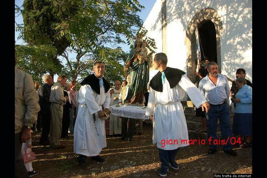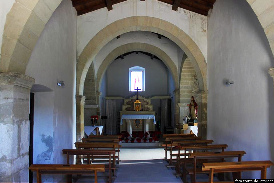 La chiesa di Santa Maria Egiziaca o del Santo SepolcroTorniamo sulla via Nazionale, al punto dove avevamo deviato a sinistra sulla via frà Nicola per raggiungere la chiesa parrocchiale, e proseguiamo, invece, dritti verso nord. Percorsa una sessantina di metri, si vede alla destra della strada la facciata della seicentesca Chiesa di Santa Maria Egiziaca detta Santa Mazzia dalla devozione popolare. Viene detta anche Chiesa del Santo Sepolcro dato che è ancora oggi sede dell’antica Confraternita del Santo Sepolcro o Dei Defunti, che risale al 1588, caratterizzata dall’abito nero con cappuccio dei suoi membri, e per questo comunemente detta Confraternita dei Neri, ossia di Is Crunfrarius Nieddus. La chiesa, in stile tardo gotico e rinascimentale, è di piccole dimensioni. La facciata mostra cinque gradini, un portale decorato con immagini di volti e vegetali, una finestrella ed un piccolo campanile a vela. Sul lato destro si può ancora vedere il solco lasciato dalla fune che veniva usata per suonare la campana, testimone di un uso continuo durante i secoli. L’interno ha un’unica aula, con due cappelle laterali, archi a sesto acuto e colonne multiple, i capitelli decorati con immagini di spighe, stemmi e volti. Si può datare parzialmente l’edificio grazie all’incisione 1680, posta su uno stemma. All’ingresso si nota una massiccia acquasantiera in pietra, caratterizzata da una particolare vasca doppia. L’altare maggiore ligneo è dedicato al Crocifisso, ha una particolare struttura sopraelevata, il simulacro del Cristo è collocato in una nicchia ed è con arti mobili, mentre le altre decorazioni sono dipinte sulla struttura lignea. Sul timpano è rappresentato San Marcello papa, primo pontefice dopo le persecuzioni di Diocleziano e Martire nel 309 dopo Cristo. La Cappella destra ospita l’altare dedicato a Santa Maria Egiziaca, si tratta di un’opera in legno con colonnine tortili decorate con tralci di vite. Nella Cappella sinistra si trova un altare in pietra, con edicola in legno intagliato, e sull’altare è presente una statua del Nazareno, e numerose statue in legno tra cui una Santa Vittoria ed un San Marcello papa.