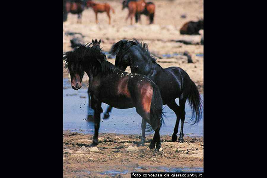 L’altopiano della Giara di Gesturi dove vivono i famosi cavallini selvaticiDal Municipio di Gesturi prendiamo verso nord la via Nazionale che, fuori dall’abitato, assume il nome di SS197 di San Gavino e del Flumini, la seguiamo per ottocento metri ed arriviamo a prendere, Leggermente a la v La Giara di Gesturi nota anche come Sa Jara Manna, viene così chiamata perché la maggior parte del suo territorio di trova nel comune di Gesturi, ma dipende, dal punto di vista amministrativo, dai comuni di Gesturi, Tuili, Setzu e Genuri. Verso sud, meno importante, si erge quella che appare come la naturale prosecuzione di questa giara, ossia la Giara di Serri e, più ad ovest, la Giara di Siddi. Si tratta di un altopiano basaltico di origine vulcanica esteso circa 42 chilometri quadrati, che si erge fino a seicento metri sul mare, come un’isola rocciosa nel paesaggio ondulato, situato fra le regioni della Marmilla e del Sarcidano nella parte centro meridionale della Sardegna. La sommità dell’altopiano della Giara si dispone secondo una direzione che va da nord ovest a sud est, ha un aspetto quasi orizzontale, ed è costituito da un basamento di marne ed arenarie su cui poggiano diversi strati alternati di calcareniti ed arenarie sedimentatisi 20 milioni di anni fa, nel Miocene. Sopra questi strati di roccia si sono create, circa 2,7 milioni di anni orsono, due spaccature, dalle quali è fuoriuscita la lava basaltica che ha ricoperto l’intero tavolato. I due coni sono la Punta Zepparedda, alta 609 metri, e la Punta Zeppara Manna, di 580 metri, tra i quali si trova la Faglia di Sa Roja che percorre trasversalmente l’altopiano, creando un gradino di circa 30 metri. Chiaramente visibile dalle zone pianeggianti, la Giara si presenta come una enorme fortezza naturale, fornita di bastioni dalle pareti scarpate ed anticamente inaccessibili, ricoperta dalla vegetazione tipica della macchia mediterranea, come sughere, roveri, eucaliptus, peri selvatici, rovi, cisti, lentischi, mirti, corbezzoli, eriche. È anche ricco di fauna selvatica, cinghiali, volpi, ricci, martore, lepri, anatre, beccacce, tordi, merli, colombacci, e rapaci come la poiana, il picchio, l’upupa e la ghiandaia. La giara è stata sede di insediamenti umani già dal Neolitico, come testimoniano le caratteristiche domus de janas, grotte a più vani scavate nella roccia ed utilizzate come luoghi di sepoltura. Lungo il perimetro sommitale della Giara, detto Sa Canoa ossia La Corona, si possono ancora osservare 24 nuraghi mentre ben 50 si allineavano un tempo ai piedi dei bastioni stessi. Anche resti di ceramica, selce e ossidiana ritrovati sopra l’altopiano fanno supporre l’occupazione diffusa del territorio in questo periodo. Molti archeologi pensano che la Giara sia stata utilizzata dai Sardi come ultimo baluardo di resistenza contro gli invasori Punici e poi Romani. Vi si trovano, inoltre, numerose pinnetas, le capanne dei pastori, costruzioni circolari in pietra con il tetto di frasche. Sulla Giara di Gesturi vivono ancora allo stato brado circa Settecento Cavallini, chiamati Equus Caballus Jarae ed in lingua sarda Is Cuaddeddus. Sono gli unici cavalli realmente selvatici rimasti in Europa. Sono famosi per non essere tozzi come i pony, bensì snelli ed eleganti, ma piccoli, alti al garrese massimo 120 centimetri. Di colore bruno scuro, hanno una lunga criniera e simpatici occhi un poco a mandorla. Probabilmente sono quelli che rimangono di una antica razza che abitava un tempo tutta l’isola, tanto da far pensare che si tratti di una razza primitiva conservatasi quasi intatta da migliaia di anni. Non esistendo in Sardegna ritrovamenti fossili di equini, si pensa che il cavallino sia stato introdotto probabilmente nel periodo nuragico o nel periodo punico. Possiamo incontrarli in branco, visitando la Giara, soprattutto ad abbeverarsi nelle depressioni nelle quali ristagna l’acqua piovana e l’acqua che sgorga dalle sorgenti naturali. Le piccole mandrie pascolano liberamente e si abbeverano nei numerosi specchi d’acqua, non distanti dai bovini, dalle capre e dai maiali lasciati al pascolo semibrado. I gruppi familiari sono composti da uno stallone e da un numero variabile di femmine, alle quali si accompagnano i puledri sino alla maturità sessuale, raggiunta la quale vengono allontanati dal gruppo dal maschio dominante. Pur vivendo allo stato brado, in massima parte sono di proprietà di allevatori di Gesturi, Tuili e Genoni, i quali provvedono a nutrirli e dissetarli durante i periodi siccità, ed altri appartengono all’Istituto per l’Incremento Ippico di Ozieri, impegnato da anni nella difesa della razza. fra aprile maggio, ed a metà settembre, si svolge, a Tuili ed a Genoni, la tradizionale esibizione dei cavallerizzi, chiamati in lingua sarda Is Insocadores, che prendono al laccio i giovani cavallini selvaggi, e quindi si effettua il rito millenario della loro marchiatura.