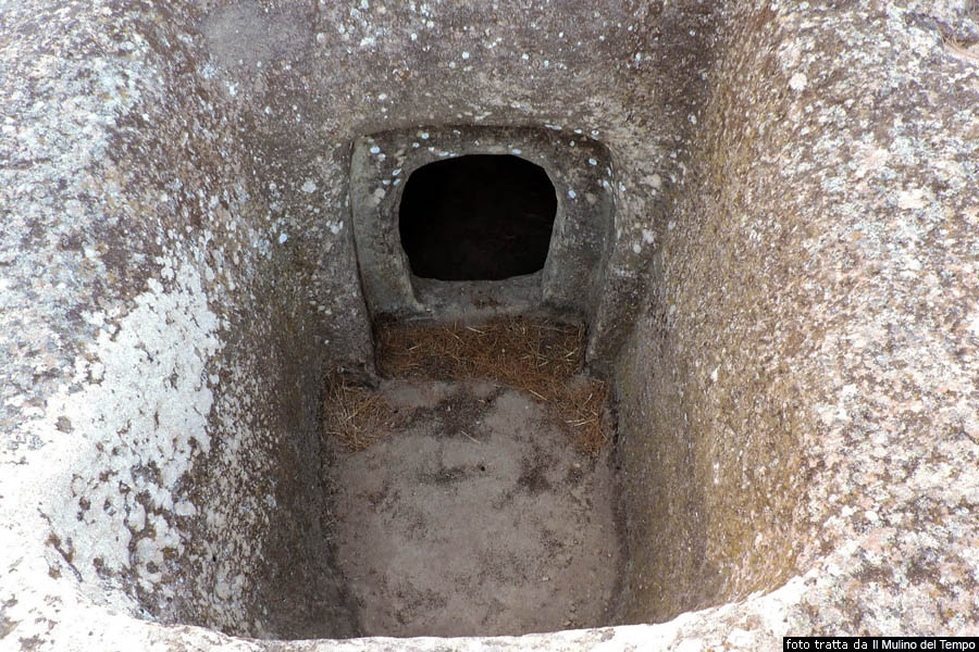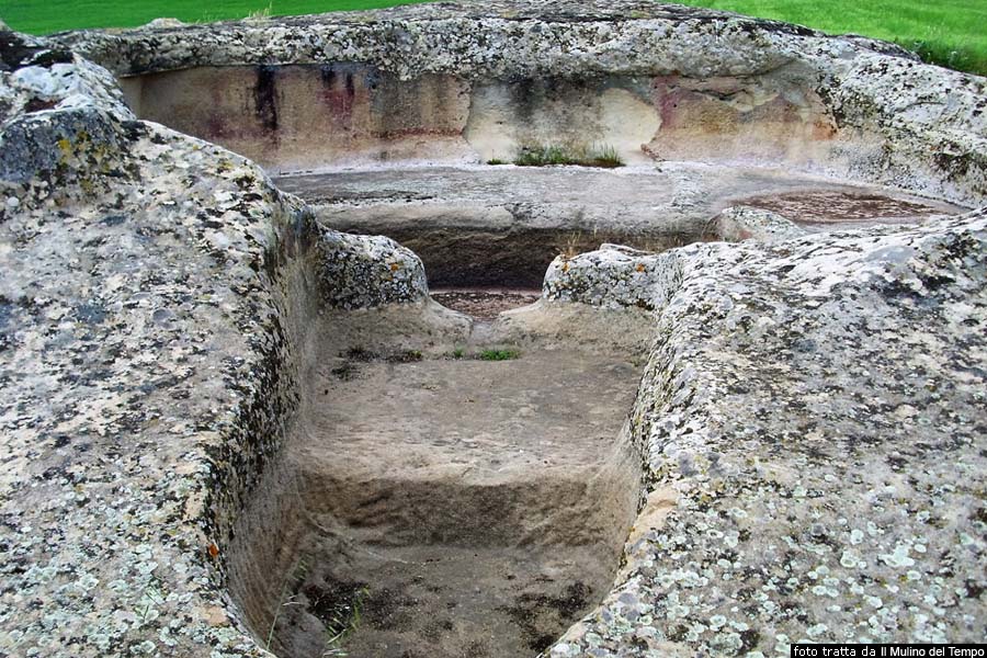 Riprendendo La strada sterrata, sulla destra è possibile visitare il secondo gruppo di tombe, chiamato gruppo A, che presentano tracce riconducibili alla celebrazione di riti funebri. Particolarmente notevole la monumentale tomba 1, risultato di diverse fasi costruttive, originariamente del tipo a pozzetto, con una anticella nella quale è presente il riquadro dipinto in ocra rossa ed una grande cella. La tomba è stata in seguito dotata di un lungo corridoio d’accesso al posto del pozzetto, ed ampliata sulla destra della grande cella, annettendo tre camerette sepolcrali di una confinante sepoltura. La tomba 2 è costituita da un pozzetto d’accesso e da una cella rettangolare il cui soffitto, parzialmente crollato, era originariamente sorretto da due pilastri. Sul pavimento è presente una vasca dove sono ricavate delle coppelle. La parete opposta all’ingresso presenta un ornato dipinto in ocra rossa, che rappresenta il simbolo della divinità maschile, ossia il Toro, dato che sono presenti due protomi taurine con schema a T entro un riquadro rettangolare, attualmente quasi invisibili a causa dell’incuria. Il colore rosso, colore del sangue e della vita, e la protome taurina sono i segni più comuni della religiosità neolitica sarda, simbolo di rigenerazione. Anche la tomba 3 è caratterizzata da una dromos di accesso. Ha destato particolare attenzione la tomba 4, articolata in un corridoio d’accesso, un’anticella e una cella. Questa tomba, secondo gli archeologi, riproduce lo schema delle capanne circolari, come dimostrano i particolari delle pareti e del soffitto dove corrono larghe fasce in rilievo simulanti il tetto e il relativo impianto ligneo di sostegno.