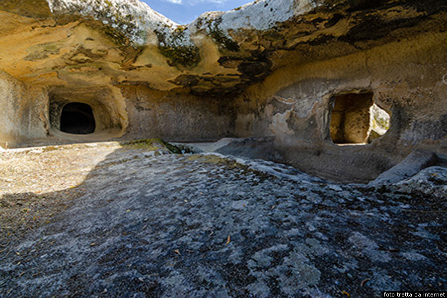 La necropoli è articolata in due aree poste a centocinquanta metri di distanza, scavate in due distinti banconi di arenaria poco distanti tra loro, e comprende una diecina di ipogei. Il primo gruppo di tombe che si incontrano, chiamato gruppo B, si trova nel lato sinistro della strada sterrata e comprende tre tombe del tipo a pozzetto, con anticella e cella. La prima che si incontra è la tomba 5, costituita da un pozzetto, un’anticella e una cella funeraria provvista di una colonna in parte distrutta. La tomba 6 si articola in un dromos d’accesso, un’anticella con nicchia semicircolare ricavata nella parete di destra, una cella con nicchia rettangolare in origine decorata con ocra rossa, un bancone sepolcrale tra la parete destra e quella di fondo e un pilastro in gran parte distrutto. La tomba 7 presenta un lungo dromos d’accesso, una piccola anticella e una grande cella funeraria semicircolare con bancone sui tre lati.