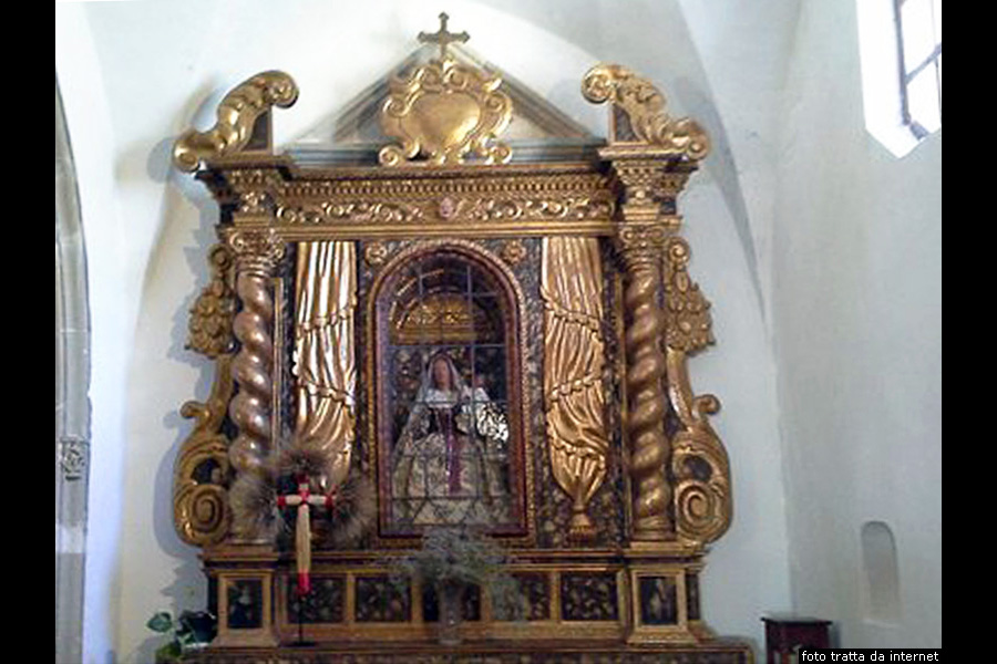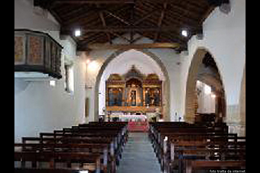 La chiesa di San Lorenzo Di fronte alla chiesa di San Sebastiano è partita la via San Sebastiano, e dopo un’ottantina di metri, dove la strada prosegue con la via Sant’Anna, invece svoltiamo a sinistra nella prosecuzione della via San Sebastiano che, dopo una settantina di metri, svolta leggermente a sinistra e diventa la via San Lorenzo che, in un centinaio di metri, ci porta a vedere sulla sinistra la Chiesa di San Lorenzo. Nel Medioevo, la chiesa di San Lorenzo è stata la parrocchia del piccolo borgo. Edificata presumibilmente agli inizi del quttordicesimo secolo in stile tardo romanico, aveva inizialmente una sola navata; ed è stata in seguito ampliata con l’aggiunta della navatella destra e sottoposta a notevoli rifacimenti. Gli interventi più rilevanti sono stati effettuati nel diciassettesimo secolo, quando sono stati ricostruiti il tetto e le cappelle di San Lorenzo e della Vergine d’Itria e innalzato il loggiato in facciata, ma non sono mancati altri restauri successivi. Oggi la chiesa si presenta in buono stato di conservazione, grazie ai restauri cui è stata recentemente sottoposta. Delle strutture originarie rimangono solo il portale lunettato ed il rosone in facciata, oltre ad una monofora nella parete laterale. Nella semplice facciata, animata da un piccolo rosone e da un campaniletto a vela a due luci sul quale sono ancora visibili le due campane originarie datate rispettivamente 1320 e 1434, si aprono i due portali d’ingresso e si addossa il caratteristico porticato, costruito successivamente alla chiesa. All’interno le due navate sono separate da arconi a sesto acuto e coperte a capriate, terminanti in cappelle voltate a crociera, e conserva un eccellente soffitto ligneo con teste di leoni e draghi.