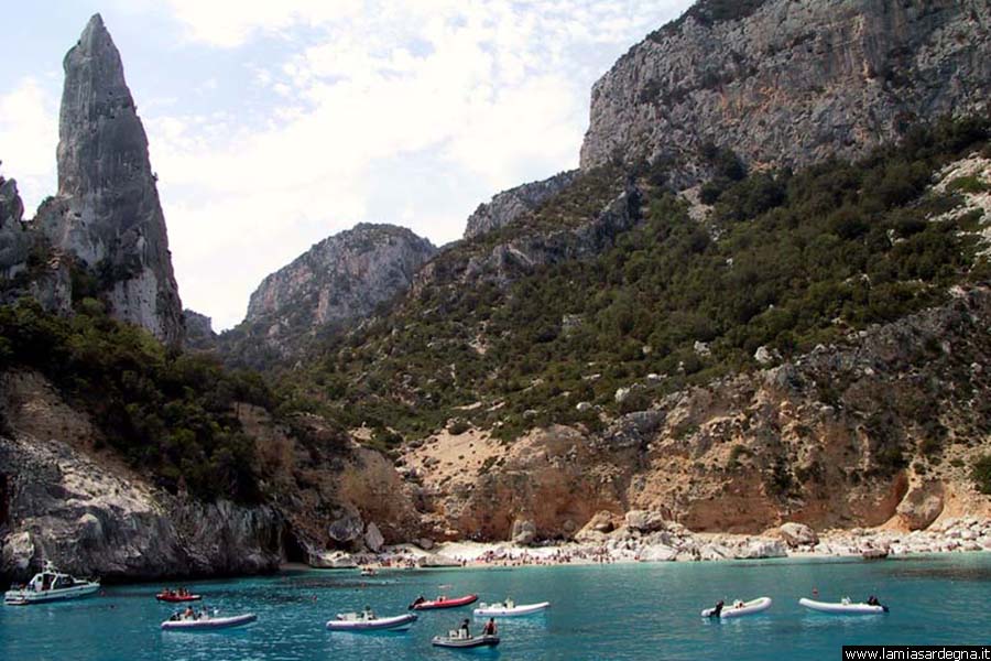 Un provvedimento del Governo guidato da Amintore Fanfani, firmato il 27 luglio 1987 dal ministro per l’ambiente Mario Pavan e dal ministro della marina mercantile Costante Degan, vieta la pesca e la navigazione nelle acque del golfo di Orosei per proteggere i pochi esemplari di Foca Monaca rimasti nella zona. In un loro documento si legge: Considerato che la Foca Monaca è una delle dodici specie di animali in maggiore pericolo di estinzione a livello mondiale, nell’area del Golfo di Orosei avente la profondità di due chilometri dalla costa e compresa tra la foce della Codula di luna e punta Pedra Longa è vietata la pesca con qualunque mezzo esercitata, nonche la navigazione con mezzi da diporto e da trasPorto turistico e qualsiasi altra anomala utilizzazione dell’area marina in questione e del tratto di spiaggia prospiciente. E di conseguenza viene creata la riserva marina per la protezione della Foca Monaca. Ma i pescatori non gradiscono, ed allora i sindaci di Baunei, Tortolì e Dorgali chiedono la revoca del provvedimento, e con loro si schiera il Consiglio regionale della Sardegna. Un anno dopo il Tribunale Amministrativo regionale accoglie il ricorso del Consiglio e del comune di Baunei, boccia il decreto Pavan e le barche tornano in mare. Il resto è ormai storia nota, nessun esemplare abita più le grotte del Bue Marino, meta di centinaia di turisti ogni giorno, mentre barche e barconi fanno avanti e indietro nelle acque del Golfo. Ma si ritiene che il piccolo mammifero forse resiste. Le ultime testimonianze di un parto in Sardegna risalgono al 1984, quando a Bosa e a Tavolara due cuccioli sono rimasti intrappolati nelle reti dei pescatori. Questi rinvenimenti hanno dimostrato l’esistenza di grotte del parto anche fuori dal golfo di Orosei. L’ultimo avvistamento in acque sarde è stato quello della foca di Villasimius, dell’estate del 2000. Alcuni avvistamenti, assicura Stefano Deliperi del Gruppo di Intervento Giuridico, ci dicono che non è scomparsa del tutto dalle coste sarde. Le segnalazioni non vengono però divulgate, piccola precauzione per evitare una nuova caccia alla Foca Monaca. È sempre viva la contesa tra Baunei e Dorgali sullo sfruttamento turistico di questo tratto di costaFino a Cala luna la costa rientra nel comune di Baunei ma è difficilmente raggiungibile da sud dato che richiede di doppiare il Capo di Monte Santu, mentre la raggiungiamo facilmente da nord, da Cala Gonone, frazione marina del comune di Dorgali in provincia di Nuoro. La scoperta turistica di questo tratto di costa è stato determinato dagli imprenditori di Dorgali. Da oltre un trentennio, i barconi carichi di turisti partono da Cala Gonone verso le spiagge più belle del golfo di Orosei, così come accade solo da qualche anno anche dagli approdi la Caletta a nord, e di Arbatax o Santa Maria Navarrese a sud. La posizione geografica di Gonone ha, quindi, favorito gli operatori di Dorgali, dove esistevano 19 alberghi, 980 posti letto, 40 operatori in grado di gestire i trasporti con le barche, 15 centri di escursione marittimi e terrestri. Questo a scapito degli operatori di Baunei, dove esistevano solo 4 alberghi, 300 posti letto, 12 operatori per i trasporti sulle barche, due centri di escursione. Sulla stampa sarda tutti gli anni, all’inizio dell’estate, esce un articolo sulla cosiddetta guerra del golfo di Orosei, ossia sulle spiagge contese tra Dorgali e Baunei, i due comuni che litigano per l’uso di immagini di coste e monumenti naturali nei depliant pubblicitari. L’appartenenza della spiaggia di Cala luna è oggetto di una forte contesa tra i comuni di Dorgali e di Baunei, anche se in base alle dichiarazioni di Nanni Fancello, primo cittadino di Dorgali dal 1979 al 1983, esisterebbe un documento che comproverebbe la titolarità dell’intera spiaggia di Cala luna da parte dl comune di Dorgali. Versione che è stata accettata dal tribunale. La Cala Goloritzè con la sua spiaggia e con il pinnacolo naturale detto l’AgugliaA circa tre chilometri da Capo di Monte Santu, passate punta Goloritzè e punta Caroddi, raggiungiamo Cala Goloritzè dichiarata nel 1995 Monumento nazionale Italiano. Il piccolo arenile è sovrastato dallo spettacolare pinnacolo naturale di Monte Caroddi, detto l’Aguglia un enorme pinnacolo alto, dalla base, circa cento metri, paradiso dei free climbers, che si apre sulla cala, una delle più belle e fotografate della costa. Sul mare si apre un Grande arco calcareo uno dei più belli di tutte le coste sarde.