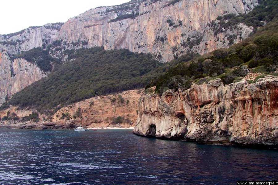 Verso Cala luna e la grotta del Bue Marino, che si trovano in territorio di DorgaliIl viaggio prosegue aggirando il promontorio Su Masongiu, un boscoso roccione alto ben 115 metri, dove tra le alte falesie vediamo sgorgare nel mare una sorgente naturale d’acqua dolce, e che, passato il quale, ci troviamo di fronte all’insenatura di Cala luna, che il promontorio protegge dai venti di scirocco.