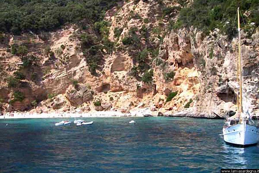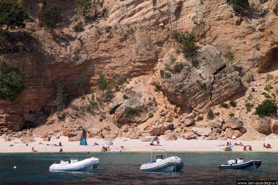 La Cala Ispuligidenìe, più nota con il nome di Cala Mariolu, con la sua spiaggiaPassata punta Ispuligi, arriviamo quindi a Cala Ispuligidenìe dal nome Ispinguli de nìe, ossia Polvere di neve, o anche le Pulci di neve, con il quale gli abitanti di Baunei la hanno sempre chiamata. È più nota, però, con il nome di Cala Mariolu con il quale la hanno battezzata i pescatori di origine ponzese che si erano installati a Gonone, quando hanno iniziato a trovare le reti rotte e svuotate del pescato, attribuendone la responsabilità a ladri o Mariuoli. Si venne successivamente a scoprire che a rubare il pescato non erano ladri, bensì gli ultimi esemplari della Foca Monaca, che avevano lasciato la grotta del Bue Marino sotto la pressione dei primi arrivi di turisti, e si erano riparati nella vicina grotta del Fico. È una delle poche cale dove è consentito l’attracco della motonave, che ci scarica sulla bella spiaggia di Cala Mariolu dominata da una alta scarpata calcarea ricoperta di macchia mediterranea, divisa da un grande scoglio in due piccole spiagge. L’arenile, immerso in una natura solitaria e selvaggia di eccezionale interesse e bellezza, è formato da sabbia costituita da piccolissimi sassolini e ciottoli di marmo bianco, lisci e dalle dimensioni microscopiche, di colore bianco candido o color crema. Si affaccia su un mare azzurro, profondo, di un colore indescrivibile e di una trasparenza senza pari. Alcune rocce calcaree affioranti dal mare formano quasi delle piccole isole, che emergono su un fondale roccioso assai adatto alle immersioni. Non sono presenti servizi, la spiaggia ed il mare sono incontaminati.