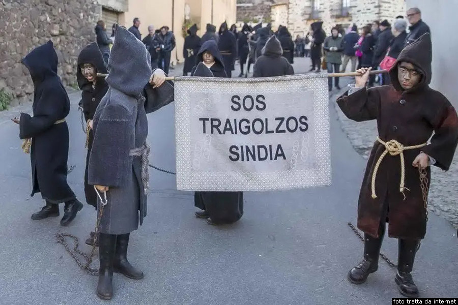 Il Carnevale di Sindia Il Carnevale di Sindia prevede la sfilata delle maschere che rappresentano Sos Tarigolzos. Nell’infinito carosello degli esseri fantastici sardi, un posto spetta alla leggendaria figura de Su Traigolzu di Sindia, una figura mitica, usata analogamente a tante sue colleghe come spauracchio per i più piccoli. Narra il mito che, nella notte tra il 14 e il 15 agosto, Su Traigolzu emergesse dalle acque liberandosi delle sue possenti catene, per poi venire nuovamente imprigionato nella notte immediatamente successiva. Sempre secondo la leggenda, egli passava questa giornata di agognata libertà alla ricerca di anime da trascinare con s al ritorno nelle profondità marine. Motivo, questo, per cui il 15 agosto era considerato estremamente pericoloso fare il bagno in mare, data la presenza del mostro pronto ad afferrare chiunque fosse tanto coraggioso da nuotarvi. Non soddisfatto, la sera era altrettanto rischioso avventurarsi per le vie della città, dove Su Traigolzu amava passare le ore notturne in cerca di anime da sacrificare, rumoreggiando con le sue pesanti catene.
