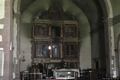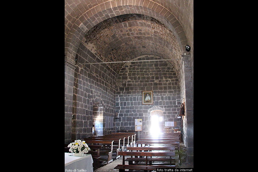 L’interno si compone di un’aula a pianta rettangolare, ad una sola navata, absidata, con copertura a quarto di sfera, mentre l’aula è coperta da una volta a botte ogivale e tetto a capanna con coperta di coppi. L’illuminazione degli interni è fornita da due monofore laterali e da quella absidale doppiamente strombate, e dalle finestre cruciformi poste sulla facciata e sul frontone ad est, al di sopra della copertura dell’abside.