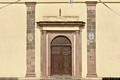 La chiesa di San DemetrioDa dove avevamo presa la via San Demetrio, che ci porta alla periferia meridionale del paese, proseguiamo per duecentocinquanta metri, poi svoltiamo a destra nella strada per l’Agriturismo Pialza e dopo una quarantina di metri, vediamo alla sinistra della strada, la facciata della Chiesa di San Demetrio. Edificata per iniziativa di un nobile ecclesiastico sindiese, il cavalier Gavino Pintor Serra, inquisitore generale dell’isola di Sardegna. Nella recente ristrutturazione della chiesa, è risultato che già esisteva una chiesa più antica e molto più piccola, orientata ad est, i cui stipiti delle porte erano in tufo bianco, che aveva un portico con le travi della copertura che poggiavano su dei pilastri di trachite. Questi ultimi sono stati, in seguito, riutilizzati nella realizzazione del sedile circolare lungo l’abside della nuova chiesa. La costruzione della chiesa è stata terminata nel 1668, data incisa in un blocco di trachite della facciata. La facciata è inquadrata da lesene angolari, e termina con un frontone timpanato. Sopra il portale è presente un bel rosone. È difficile indicare lo stile di questa bella costruzione, che mostra una interessante commistione di forme romaniche e gotiche, che si spiega con l’utilizzo nella costruzione di pietre squadrate dell’Abbazia di Corte, come gli archetti del campanile a vela, e, pare, lo stesso bel rosone della facciata.