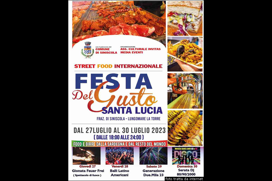 Tra luglio ed agosto, divese sagre a Santa Lucia di Siniscola con tra le altre la Sagra del Pesce, la Festa del Gusto, la Sagra del Maialetto; la seconda domenica di agosto la Festa di Stella Maris, una delle più suggestive dell’estate, ed è un evento di grande spiritualità che richiama ogni anno centinaia di fedeli, in fila per omaggiare Nostra Signora di Stella Maris nella località Marina di Capo Comino; ad agosto si svolge anche la Festa di Sant’Elena, presso l’omonima chiesa campestre; a inizio settembre, la Festa di Santu Simbrichi e Santu Portholu, ossia di San Simplicio e San Bartolomeo, presso l’omonima chiesa campestre; la terza domenica di settembre viene festeggiata la Madonna della Salute, nella chiesa campestre in località Luittu; la seconda domenica di ottobre si svolge la Festa di Nostra Signora delle Grazie, che è la festa più importante del Siniscola, con riti religiosi e festeggiamenti civili la terza domenica di ottobre si svolge la Festa di Sant’Efisio.