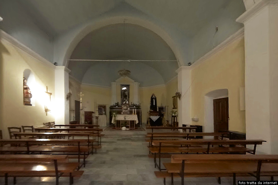 L’interno presenta una navata unica con volta a botte e la zona del presbiterio rialzata rispetto al piano della navata. La volta è dipinta con pitture murales con storie della Vergine, mentre nelle lunetta della controfacciata figura l’immagine di San Domenico, Santo tutore spirituale di tutte le Confraternite intitolate alla Madonna del Rosario. Sulle pareti si segnalano i dipinti murales con le storie tratte dall’Antico e Nuovo Testamento dipinte dal pittore toscano Spirito lari nel 1915. Nella parete destra del presbiterio è raffigurato l’episodio biblico di Giuditta e Oloferne, mentre sul lato sinistro una scena culminante della battaglia di lepanto, vinta la prima domenica di ottobre del 1571 dalle flotte cristiane contro i Turchi nelle acque del Mare Adriatico, nel giorno in cui le Confraternite del Rosario facevano le loro processioni, e, per questo, il papa Pio V attribuì la vittoria all’intercessione della Vergine e ordinò che nello stesso giorno di ogni anno si celebrasse la festa. Nel presbiterio si trova la statua di Santa Lucia, di Santa Margherita, dell’Angelo Custode e di San Pasquale Baylon.