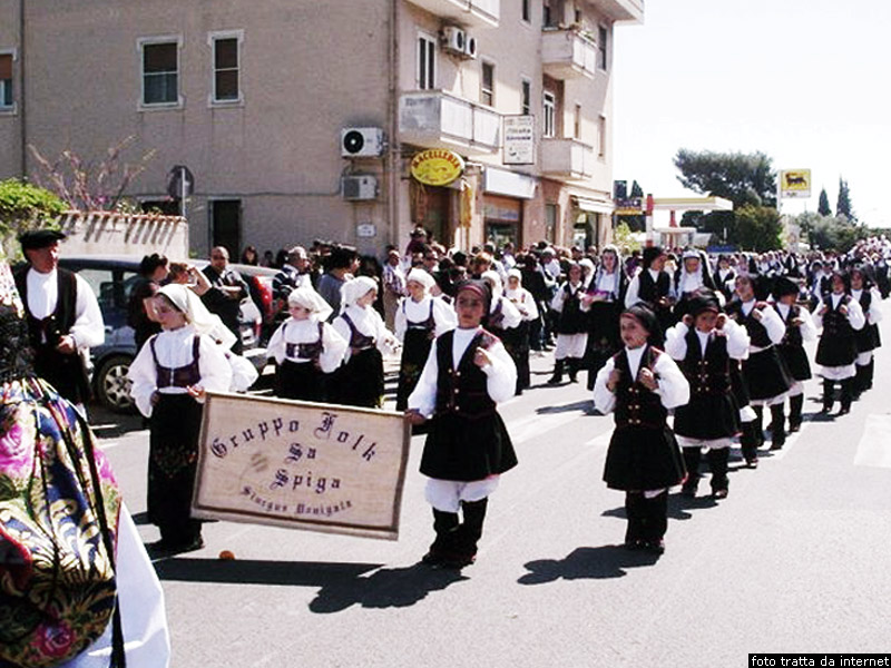 Il comune di Siurgus Donigala è un centro derivante dall’unione nel 1927 del comune di Siurgus e di quello di Donigala. Sebbene ora si tratti di un unico comune, la popolazione dei rispettivi centri ha conservato quelle che sono le proprie tradizioni, da qui la celebrazione di due feste patronali, San Teodoro patrono di Siurgus, e Santa Maria patrona di donigala. Tra le principali feste e sagre che si svolgono a Siurgus Donigala vanno citate, il 17 gennaio la Festa di Sant’Antonio Abate Con il rito del rogo, per il quale i ceppi, una volta accesi, diventano il punto di aggregazione della popolazione, che trascorre la notte a bere ed a degustare i buoni prodotti tipici; il 20 gennaio, la Festa di San Sebastiano; le manifestazioni del Carnevale con la sfilata per le vie del paese di carri e maschere, e con zeppolata e favata finale; a fine aprile, la Sagra del Pane, che prevede il confezionamento e la mostra del pane tradizionale, con degustazione e convegno; a fine maggio, la Festa di Santa Susanna, nell’omonima chiesa campestre; a luglio, la manifestazione culturale Luglio Siurgus donigAlese, manifestazione con spettacoli folcloristici, rappresentazione teatrali, cinema all’aperto, mostre, degustazione di prodotti locali, ed altro; i primi di agosto, la Sagra della pecora; il 20 agosto, si celebra la Festa patronale di San Teodoro Martire, il primo patrono del paese; sempre ad agosto, si svolge la Sagra della pecora; l’8 settembre, la Festa di Santa Maria, il secondo patrono del paese; la seconda settimana di ottobre, la Sagra della Madonna dei sette dolori, per la quale viene esibita in processione la croce del pane confezionata per l’occasione; in occasione di questa sagra, si svolge anche Sa festa de in Bagadius, la festa degli scapoli. Sa festa de Is BagadiusA Siurgus a ottobre si celebra una antichissima festa la cui origine si perde nella notte dei tempi, ossia la Festa de Is Bagadius, organizzata da un comitato di giovani non sposati, che prevede un banchetto comunitario, a base di arrosti, pani decorati, maccheroni al ragù. Un tempo questa festa durava otto giorni, dal secondo martedì fino al terzo lunedì di ottobre. Con essa si celebrava la Bayanìa, l’età nella quale i giovani erano maturi per il matrimonio. La domenica aveva luogo la benedizione della Croce del pane e una processione dedicata alla Vergine Addolorata alla quale partecipava tutta la popolazione. La croce portata in processione era rivestita di pane lavorato a coccois, pesava tra i venti ed i trenta chili, e il suo rituale prevedeva un meticoloso rispetto delle posizioni assunte da ciascuna figura. Per la costruzione della croce, che viene prodotta ancora oggi, si utilizza una base di legno a forma di croce, anche se gli anziani ricordano che anticamente era fatta di canne fresche. Al centro della croce viene posizionato un pane di forma circolare, S’Anguli, il pane più grosso, vocabolo che deriva dall’arabo magrebino angul, termine che sta ad indicare una schiacciata di pane con uno o più uova sode nel mezzo. Vicino ad esso sono collocati sei Pillonis, ossia uccelli, tre bianchi e tre gialli. I bracci della croce vengono decorati con otto Crabiolus, otto Cuaddus, quattro Pipias ossia bamboline, quattro Arregulas a forma di croce greca di probabile origine bizantina, e nove Coccois de pizzus ossia pani ricamati. Finita la festa, un tempo il pane benedetto veniva suddiviso tra tutte le famiglie che lo tenevano quale rimedio contro le malattie e le disgrazie. La festa aveva anche una sua parte laica, che aveva inizio il martedì notte con la confezione del pane nella casa del primo Obriere, che nella sua lolla accoglieva i giovani, e nella quale si svolgevano i balli negli intervalli della lavorazione del pane. Il giovedì mattina gli Obrieri si recavano in montagna a portare in paese una vacca chiamata Sa bacca de Is Bagadius, la quale veniva accolta all’ingresso del paese dalle Bagadias, le ragazze nubili, che la infioravano e le mettevano al collo una campanella tenuta da un collare lavorato artisticamente. La vacca veniva portata in corteo e condotta nel cortile della casa del primo Obriere dove restava fino al sabato, quando veniva sacrificata per il grande pranzo che si svolgeva la domenica e al quale partecipava un rappresentante di ogni famiglia. La festa riprendeva il sabato e proseguiva fino al lunedì notte, giorno in cui si svolgeva un ultimo pranzo tra gli Obrieri e quelli che erano incaricati di organizzare la festa l’anno successivo, e si ballava accompagnati dalle launeddas. Questa festa con forte connotazione pagana, è stata abolita dalla chiesa nel 1952.