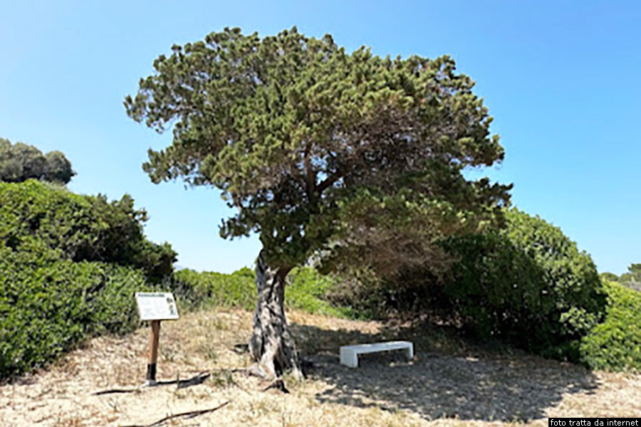 Vicino alla foce del Rio Alessu, sulla spiaggia di Foxi Murdegu, riesce a vivere sulle dune di sabbia un grande albero di ginepro, generato dalla potenza della natura che non può essere contenuta. Si tratta di un Ginepro fenicio, noto con il nome di Juniperus phoenicea. |