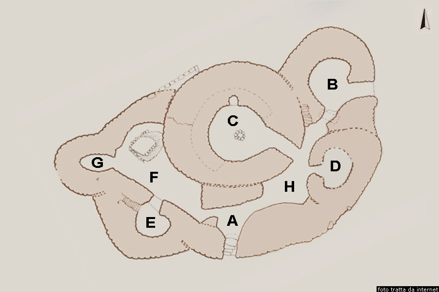 I resti del nuraghe complesso Anastasi chiamato anche nuraghe Nastasi Percorsi ancora ottocentocinquanta metri da dove avevamo preso la deviazione per la spiaggia Melisenda, prendiamo la prima sterrata sulla destra poco dopo aver superato il ponte sul torrente Nastasi, e, percorsi quasi trecento metri, vediamo, sula destra, la collinetta sulla quale si trovano, a 42 metri di altezza, i resti del nuraghe Anastasi chiamato anche nuraghe Nastasi. Si tratta di un nuraghe complesso immerso in una fitta vegetazione, che presenta una massiccia torre centrale tronco conica, cinta da un bastione difensivo dotato di quattro torri secondarie, ed all’interno due cortili e un pozzo cisterna. Il nuraghe è composto da un ambiente di disimpegno (A), una torre arcaica (C) con ingresso rivolto a est sudest che definiremo mastio, quattro torri secondarie (B, D, E, G), due cortili (F, H), un pozzo. Si pu accedere al complesso da due ingressi, dei quali uno guarda a sud e immette nell’ambiente A, l’altro guarda ad est e si apre nella torre B.