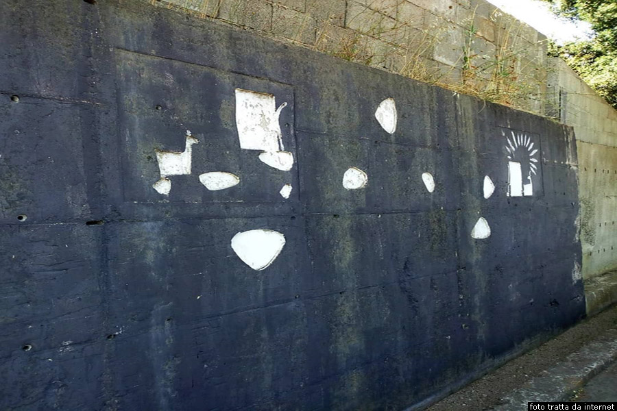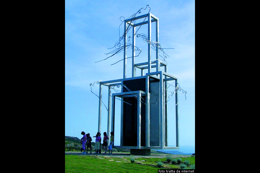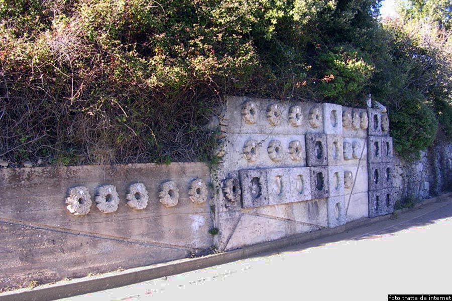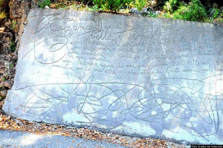 Più avanti si può vedere l’opera 'Il Muro del groviglio' di Maria Lai Passata una curva a tornante, circa cento metri più avanti si può ammirare, sul muro costruito alla destra della strada per contenere lo scolo delle acque e le frane, l’opera Il Muro del groviglio realizzata da Maria Lai nel 2005, che accoglie con grafia lineare e quasi infantile diversi pensieri dell’amico e maestro Salvatore Cambosu. L’opera è stata realizzata sul cemento ancora fresco, in collaborazione con le committenze del luogo. In un’intervista dedicata alla realizzazione di quest opera, Maria Lai dichiara che Ogni committenza è sempre tentata di costruire in modo sbrigativo e in economia. Ogni manovalanza è abituata a eseguire operazioni su progetti chiari e definitivi. Il mio modo di procedere, che non ama discutere più di tanto le idee che man mano vado elaborando, spesso con ripensamenti suscita commenti sconcertanti, e nel migliore dei casi, ironici e divertiti. Come quando dichiaro che è sempre il muro a decidere, e non sempre il muro parla chiaro, ha bisogno di tempo. Il muro ci deve pensare! Dicevano gli operai fingendo una loro complicità con il muro.