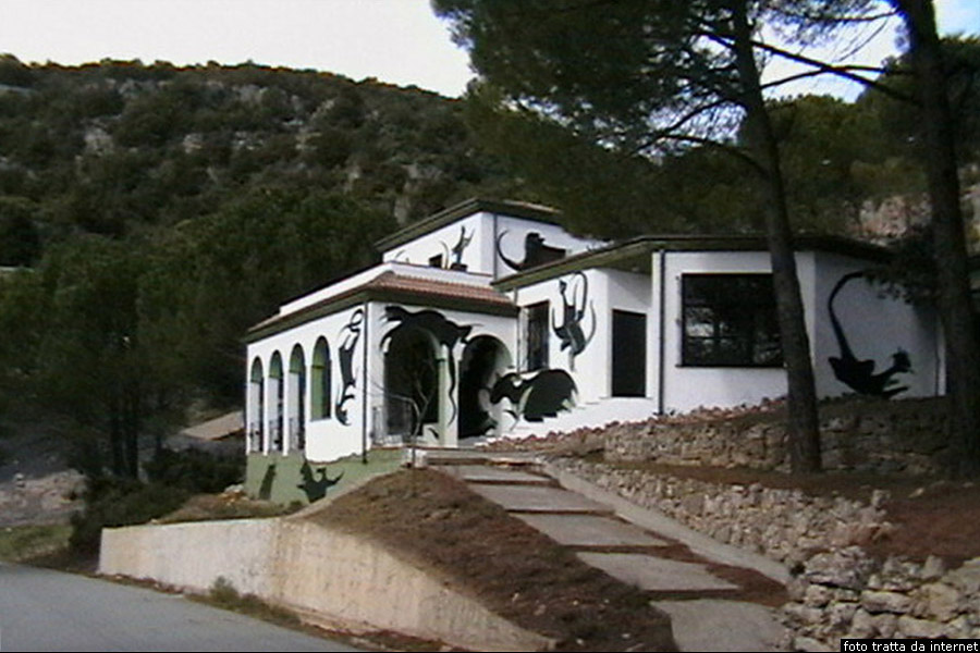 Lungo la strada per la grotta si trova 'La casa delle Inquietudini' di Maria Lai Circa duecento metri prima di arrivare al piazzale di accesso alla grotta di Su Marmuri, alla sinistra della strada si vede La casa delle inquietudini che è un murale realizzato nel 2005 da Maria Laisu un edificio nato nel 1995 per ospitare un ristorante o una attività turistica, ma che già intorno al 2002 era caduto in disuso ed era stato abbandonato. A livello tecnico, si tratta di un intervento pittorico dai cromatismi verdi, bianchi e neri, che rappresentata inaspettati esseri mostruosi a forma di draghi e di varani, alternati da pensieri con inferriate intrecciate sulle finestre. Inizialmente la base era verde e i mostri neri, ma nel 2007 l’artista lo ha ridipinto utilizzando i suoi colori preferiti, ossia il bianco ed il nero, anche se qualche macchia di verde rimane. Maria Lai giustifica la scelta dei demoni neri dipinti nelle pareti, indicandone l’origine nel racconto La capretta di Salvatore Cambosu, nel suo Miele Amaro.