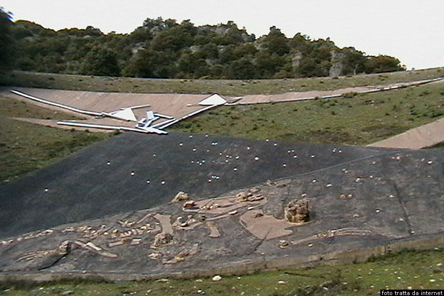 Sotto l’ingresso della grotta si trova la grande opera 'La scarpata' di Maria Lai Poco più di altri cento metri più avanti, alla sinistra della strada che porta a un’area di parcheggio, sotto all’ingresso della grotta di Su Marmuri, nel 1993, Maria Lai realizza La scarpata più che una scultura, un’opera che si estende per trenta metri di altezza e ottanta di lunghezza, e sovrasta la salita tortuosa e ripida di una strada davanti ad una vastità di paesaggi. La stessa Maria, in un intervista, afferma che è un’opera insolita perché è nata in uno spazio singolare, nella solitudine di un paesaggio selvatico. Il luogo in cui è stata realizzata, era una vecchia discarica, e Maria pensa di costruire lì una grande geografia di forma trapezoidale, in grado di ricordare la storia del mondo. Ipotizza una vera luce, un gioco di specchi per catturare i raggi del sole e rimandarli a grande distanza, con la parete che fa incontrare pietre e metalli, finti resti di un dinosauro e finto articolarsi di un indagine nello spazio. La realizzazione dell'opera viene affidata alla Cooperativa di muratori di Ulassai, e Maria presenzia a ogni cosa. Ma le parti metalliche, disposte in un ordine rigoroso, una notte vengono sparpagliate qua e là dal vento, così che la mattina dopo, quando Maria arriva, i muratori quasi scusandosi per non averle fissate, le chiedono come riposizionarle. Ma Maria risponde che quello scompiglio aveva un suo significato, che il tempo spesso completa l opera d arte, e preferisce fissare quelle parti così come il vento aveva suggerito.