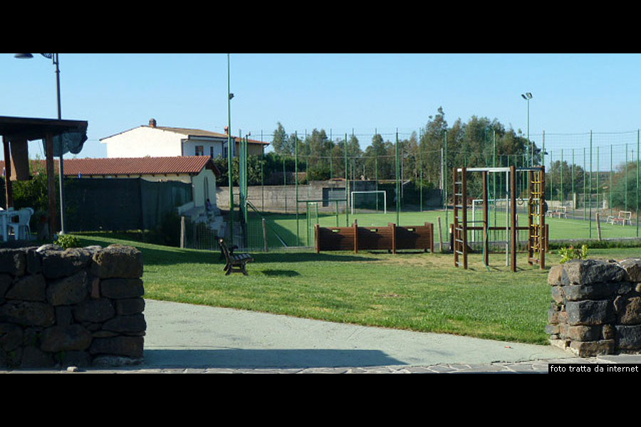 Nella piazza Luigi Cadorna dove eravamo arrivati con la via San Gemiliano, procediamo verso destra in direzione della via Regina Margherita e, sulla facciata dell’ultimo edificio a sinistra, è presente un murale che raffigura una processione, realizzato da Pina Monne, la muralista nata a Irgoli nel 1971 ma residente a Tinnura, che si è da sempre distinta per la sua attività pittorica e di ceramista. Il complesso sportivo di Villanova TruscheduDa dove dalla piazza Luigi Cadorna siamo arrivati in via Regina Margherita, la prendiamo verso destra e la seguiamo per centottanta metri, poi prendiamo a destra la via Santa Barbara che, dopo una sessantina di metri, arriva a un bivio, dove prendiamo a destra la prosecuzione della via Santa Barbara. Lungo questa strada, alla destra ed alla sinistra, si trova il Complesso Sportivo di Villanova Truschedu. Alla destra della strada è presente il Campo da Calcetto, ossia da Calcio a cinque, con fondo in erba sintetica, dotato di tribune in grado di ospitare 120 spettatori.